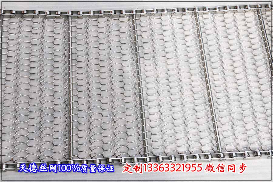 今天上午湖北咸寧客戶來電咨詢鏈條式不銹鋼網帶,用來蒸煮熱干面,干面如同蕨根粉般粗細,在經過一番的了解后,定制規格為: 食品輸送網帶我們采用不銹鋼304材質,這樣不會影響食品的質量,干凈衛生,能夠保證面條的原有鮮味。面條輸送網帶采用的結構形式為鏈條式不銹鋼網帶,鏈條網帶總寬為40公分,長為20米,每米輸送網帶上面的載重量在10公斤以下,根據輸送使用絲徑為1.0毫米,根據輸送面條的大小不銹鋼網帶的孔定制為5*10毫米,不銹鋼鏈條網帶的節距為25.4毫米,不銹鋼圓棒支撐桿直徑為6毫米,圓棒之間的間距為150毫米,材質選用全部304不銹鋼。